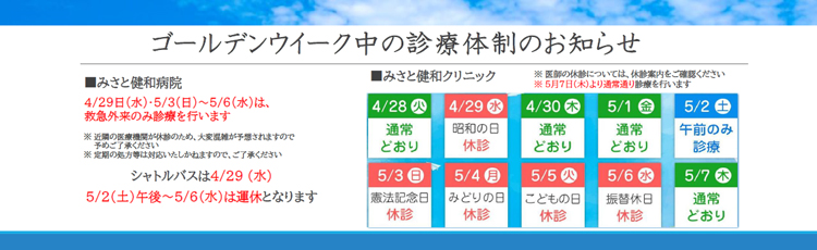 | 2026年03月16日 | みさと健和クリニックゴールデンウィーク中の外来診療体制 |