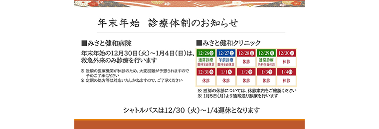 | 2025年12月01日 | みさと健和クリニック年末年始休診のお知らせ |